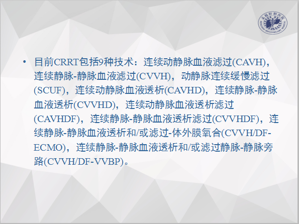 目前CRRT包括9种技术:连续动静脉血液滤过(CAVH),连续静脉-静脉血液滤过(CVVH),动静脉连续缓慢滤过(SCUF),连续动静脉血液透析(CAVHD),连续静脉-静脉血液透析(CVVHD),连续动静脉血液透析滤过(CAVHDF),连续静脉-静脉血液透析滤过(CVVHDF),连续静脉-静脉血液透析和/或滤过-体外膜氧合(CVVH/DF-ECMO),连续静脉-静脉血液透析和/或滤过静脉-静脉旁路(CVVH/DF-VVBP)。
