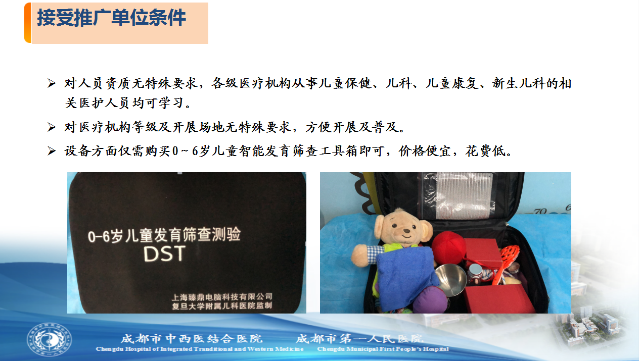 该技术操作简便快速,具有较高的敏感度,较为简单、实用、有效,故对人员资质无特殊要求,各级医疗机构从事儿童保健、儿科、儿童康复的相关工作人员,包括医生和护士均可学习。同时对医疗机构等级及开展场地均无特殊要求,方便开展及普及。设备方面仅需购买0~6岁儿童智能发育筛查工具箱即可,价格便宜,花费低。